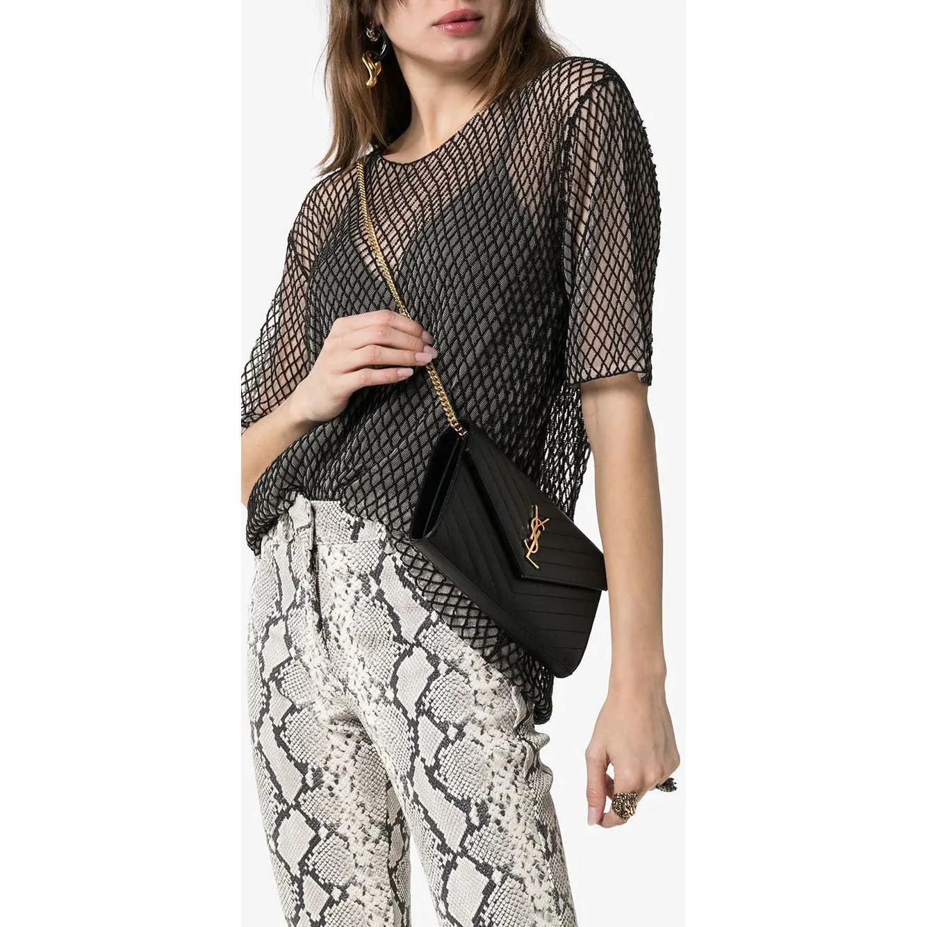 Portefeuille Monogramme à bride portée épaule Saint Laurent avec rabat sur le devant, bride portée épaule détachable, finitions dorées, poche intérieure zippée et plaque logo dorée. Couleur: noir.
